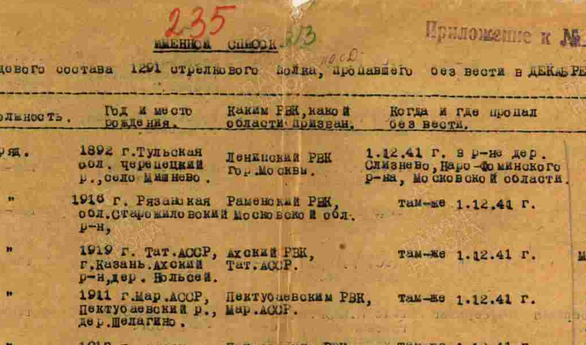 | 4 | военфельд. | Непомнящих А. Д. | 1291 сп 110 сд | пропал б/в / Слизнево | |